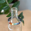 De chakra-lavasteenarmband van kraaltjes in de kleuren van de 7 chakra’s, geregen op elastiek.