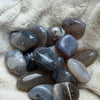 Grijze agaat is een mooie steen, variërend van licht tot donkergrijze/blauwe tinten. Kenmerkend voor deze steen zijn de ringvormen.